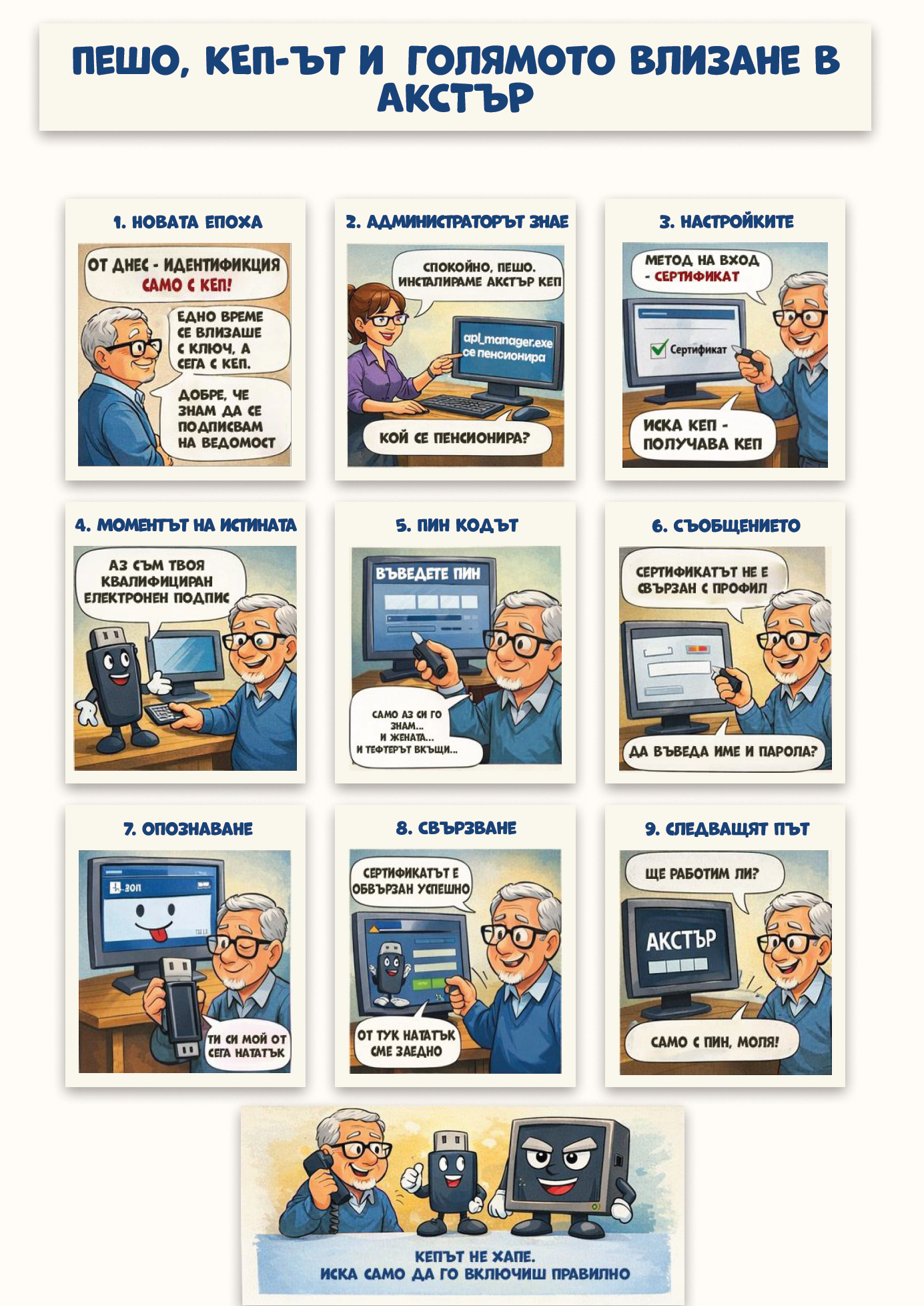 В новогодишната нощ, леко замаян от виното, нашият АКСТЪР AI АСИСТЕНТ захапа „Инструкцията за логване с КЕП“ и произведе този комикс.