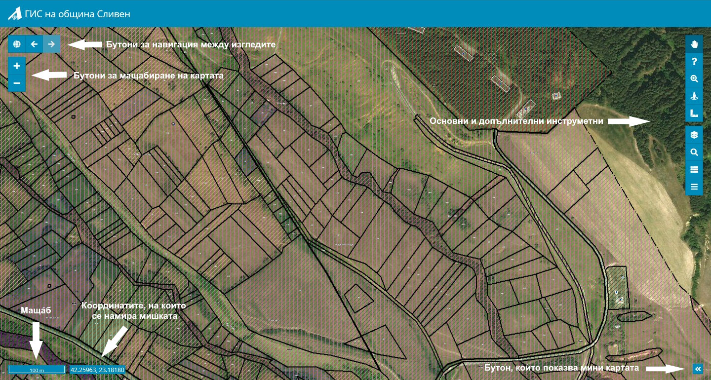 Бутонът „Мащабиране до цяла карта“ (фиг. 3), намиращ се горе вляво служи за позициониране на изгледа, така че да се вижда цялата карта.